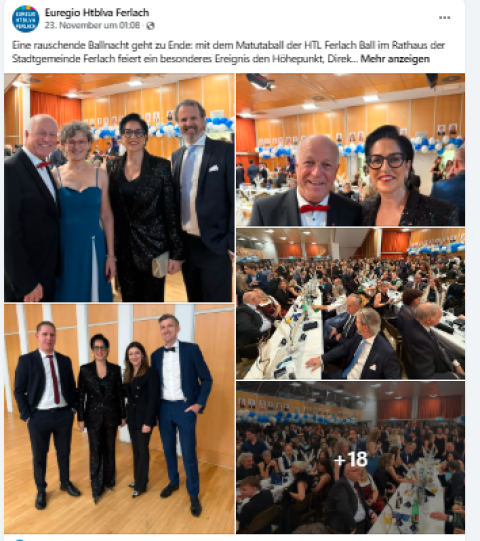 Eine rauschende Ballnacht geht zu Ende: mit dem Matutaball der HTL Ferlach Ball im Rathaus der Stadtgemeinde Ferlach feiert ein besonderes Ereignis den Höhepunkt, Direktorin Bergmoser und die anwesenden Professor:innen sind stolz auf die Schüler:innen der Maturaklassen. Ebenfalls ehrt der Bürgermeister Ingo Appé durch seinen Ehrenschutz die Veranstaltung.